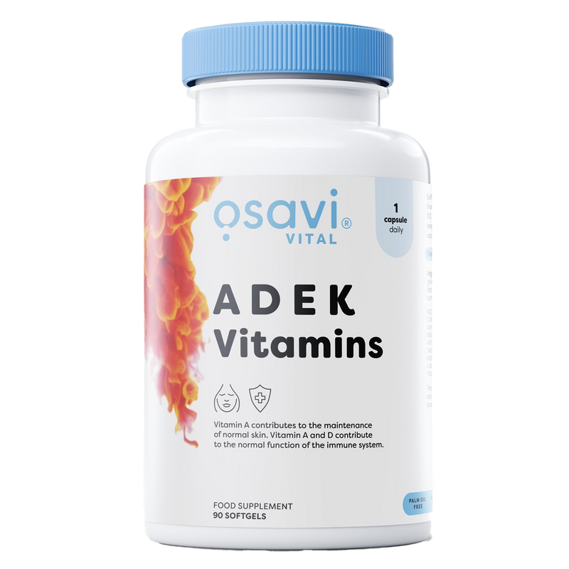 Osavi ADEK Vitamins - 90 softgels provide a powerful blend of essential vitamins crucial for overall wellness. Formulated with natural beta-carotene derived from Dunaliella salina algae, vitamin D3 (cholecalciferol), vitamin E (D-alpha-tocopherol), and vitamin K2 (menaquinone-7) encapsulated in coconut-derived MCT oil, this dietary supplement aims to boost your immunity effectively. Experience the combined benefits of four fat-soluble vitamins, each chosen to complement the others and support your body's functions. Vitamin A and vitamin D work synergistically to contribute to immune health and cellular growth, while vitamin D and K are vital for bone strength and dental health. Regular intake helps ensure your body is well-equipped to face daily challenges. The importance of these vitamins canāt be overstated: Vitamin A promotes the health of mucous membranes and skin, while aiding vision and iron metabolism. Additionally, beta-carotene plays a role in protecting your skin against UV damage and promoting its overall beauty. Vitamin D, often referred to as the sunshine vitamin, not only supports immune function but also plays a crucial role in muscle coordination and calcium regulation, ensuring your bones remain robust. Vitamin E adds another layer of protection by combating oxidative stress, helping maintain a healthy balance in your system. Lastly, vitamin K2 is essential for optimal blood clotting and supporting skeletal health, with MK-7 offering maximum bioavailability. This combination of vitamins aims to prevent deficiencies and therefore the associated symptoms, such as dry eyes, night blindness, and weakened bones. To reap the full benefits and ensure optimal absorption, Osavi ADEK Vitamins are best taken with a meal. Theyāre produced with the highest quality standards and are free from common allergens including gluten, lactose, and GMOs, making wellness accessible for everyone.